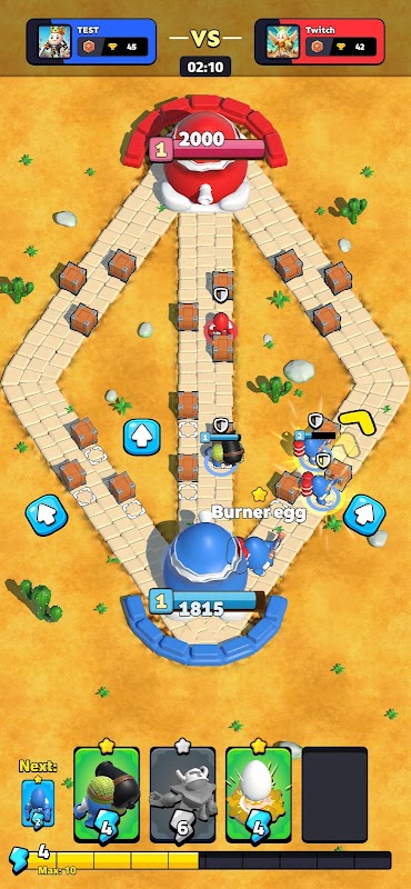 ¡Sumérgete en un intenso enfrentamiento donde la guerra entre huevos rojos y azules continúa! En este juego de cartas único, cada jugador tiene una baraja de cartas estratégica que se utiliza para convocar unidades con habilidades especiales capaces de cambiar el rumbo de la batalla. La arena, dividida en tres carriles, se convierte en el campo de batalla donde cada decisión cuenta.