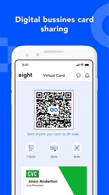 Eight users can just open the app, hold their phones together, and exchange digital cards immediately. If the other person doesn’t use Eight, share a QR code or URL that links to your Virtual Card and scanned information.