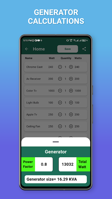La calculadora de carga eléctrica calcula la electricidad total consumida por los electrodomésticos.