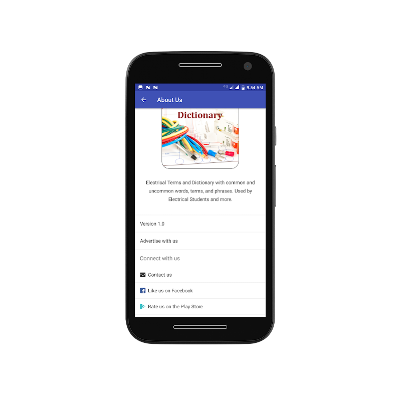 Free Offline Electrical Dictionary app containing words and their pronunciation , definition and synonyms for Electrical practitioners and students to look up the definitions and technical terms in a second.