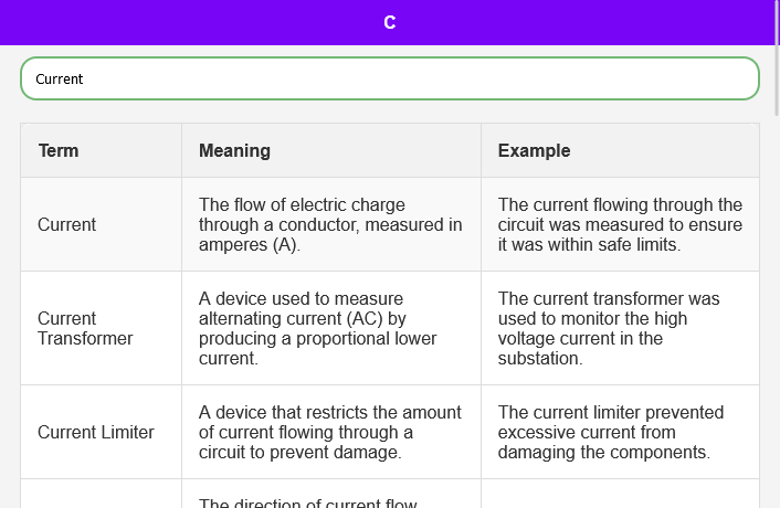 Definiciones claras: cada entrada del diccionario eléctrico proporciona una definición precisa y fácil de entender. Nuestro objetivo es simplificar conceptos eléctricos complejos para que cualquier persona, independientemente de su nivel de experiencia, pueda comprenderlos sin esfuerzo.
