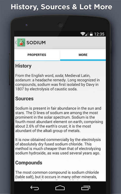 The Elements app contains detailed chemical and physical information of all chemical elements. The app comes with with dynamic layouts showing names, electrons, oxidation, trend visualization, orbitals, isotopes, search with element name etc.