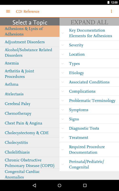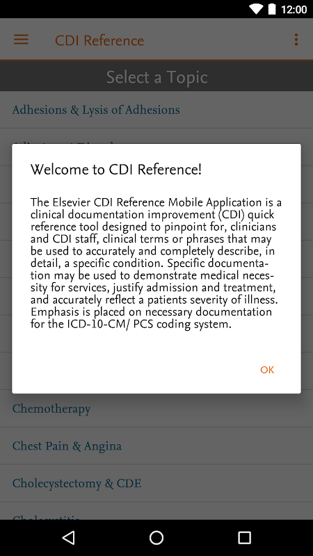 The Elsevier CDI Reference Mobile Application is a clinical documentation improvement (CDI) quick reference tool designed to pinpoint for, clinicians and CDI staff, clinical terms or phrases that may be used to accurately and completely describe, in detail, a specific condition. Specific documentation may be used to demonstrate medical necessity for services, justify admission and treatment, and accurately reflect a patients severity of illness. Emphasis is placed on necessary documentation for the ICD-10-CM/PCS coding system. Physician documentation should NEVER include information that is enhanced, modified, or otherwise inaccurate for the purposes of determining or increasing payment, or for any other situation in which a physician or facility may falsely gain.