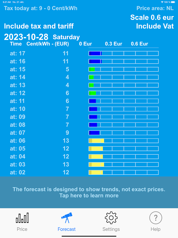 En esta aplicación podrás consultar los precios spot de la electricidad para las próximas 24 horas, precios históricos y una previsión para los próximos días. Los precios futuros se muestran tan pronto como estén disponibles, con actualizaciones por la tarde para el día siguiente. Puedes elegir ver precios con impuestos, aranceles e IVA. También puede ingresar sus adiciones personales al precio spot, precios fijos y tarifas y cargos de electricidad.