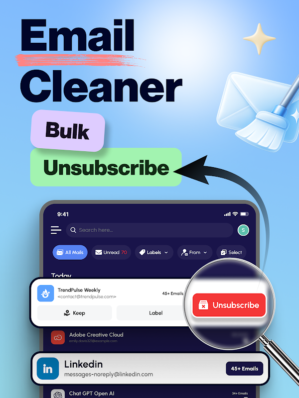 ¿Tu bandeja de entrada de Gmail está repleta de basura? ¿Buscas un potente bloqueador de spam? Nuestra app de limpieza de correo es la solución. Como un eficiente limpiador de bandeja de entrada para Android, esta app te ayuda a limpiar tu bandeja de entrada y a eliminar el correo basura para siempre. Consigue una verdadera limpieza digital con un potente limpiador de correo que te devuelve el control.