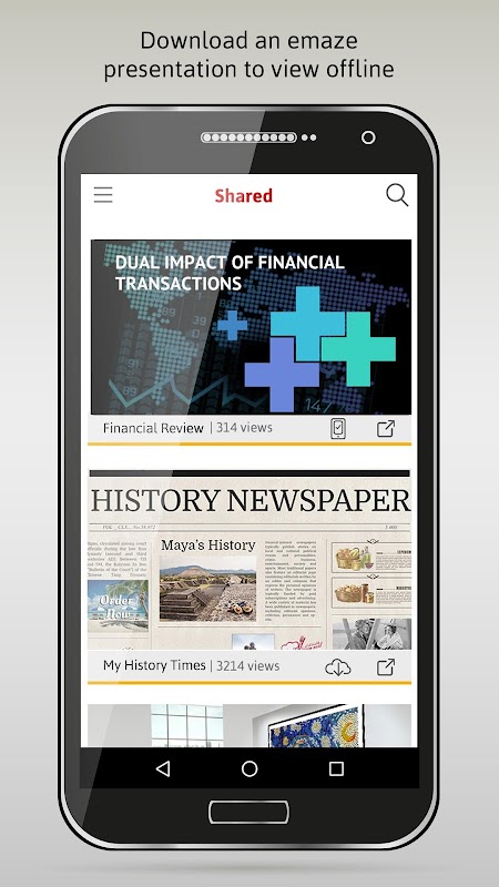Watch your own emaze creations or those collaborated with you by your colleagues or Team easily and seamlessly in high definition. The emaze app automatically syncs with your emaze account so you can watch the most updated versions of your online presentations wherever and whenever you need to. Download your presentation for FREE in the app to access and view your presentation even when you are not connected to wifi.