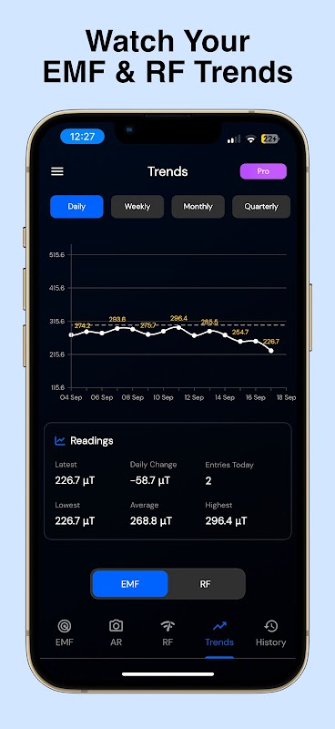 Convierte tu teléfono en un detector profesional de campos electromagnéticos. Experimenta la revolucionaria visualización de RA para CEM y un potente escáner de RF para la exposición a Bluetooth, todo en una app limpia y que prioriza la privacidad.