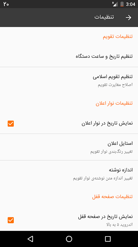 با لمس تاریخ روز در نوار نوتیفیکیشن, صفحه اصلی اپلیکیشن باز میشود که در این صفحه نیز میتوانید تاریخ روز را در سه حالت شمسی / قمری و میلادی ملاحظه کنید.