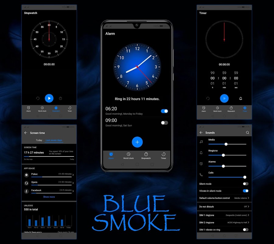 Blue Smoke Theme para EMUI 9.1 es diferente y no se puede actualizar desde el sistema EMUI anterior. Hay muchos compromisos gráficos, porque los íconos de la barra de estado y los íconos de la barra de navegación no son visibles sobre un fondo negro en los dispositivos con pantallas LCD (sin el modo oscuro).