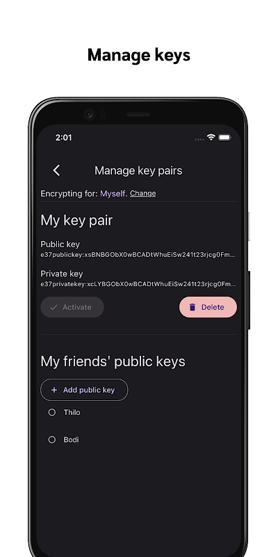 Encrypt37 no tiene servidor, todo sucede en su dispositivo: su par de claves, el proceso de encriptación, los textos y archivos encriptados.