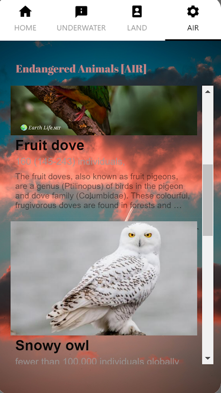 Es una aplicación donde puedes ver la lista de animales en peligro de extinción que hay en el mundo. Esta aplicación brinda a los usuarios información sobre animales en peligro de extinción.