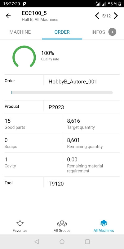 máquina. La auténtica aplicación de taller proporciona al director de producción una visión completa y fácilmente disponible de todos los factores relevantes para la producción. Al detectar los problemas en una fase temprana, se pueden evitar pérdidas relacionadas con la calidad o los tiempos de inactividad y se puede garantizar el uso óptimo de todos los recursos de producción.