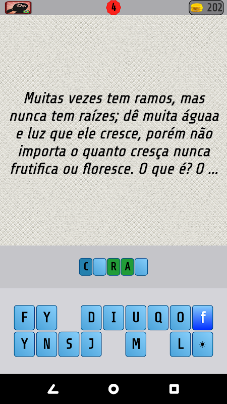 Recoge monedas para gastarlas en adivinar las respuestas, compartirlas con tus amigos, calificar la aplicación o descargar un juego gratis. Gaste sus monedas sabiamente.