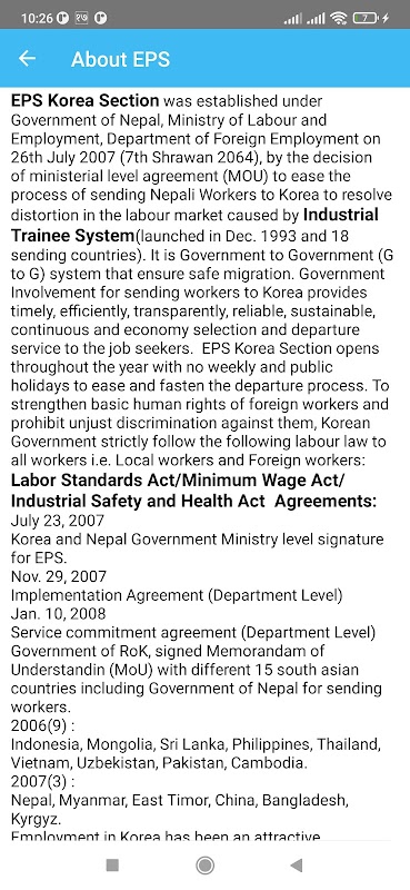 La Sección de Corea de EPS se estableció bajo el Gobierno de Nepal, Ministerio de Trabajo y Empleo, Departamento de Empleo Extranjero el 26 de julio de 2007 (7 de Shrawan 2064), por decisión de un acuerdo a nivel ministerial (MOU) para facilitar el proceso de envío de trabajadores nepaleses a Corea para resolver la distorsión en el mercado laboral causada por el Industrial Trainee System (lanzado en diciembre de 1993 y 18 países de origen). Es el sistema de Gobierno a Gobierno (G a G) el que garantiza una migración segura. La participación del gobierno para enviar trabajadores a Corea brinda un servicio de selección y salida oportuno, eficiente, transparente, confiable, sostenible, continuo y económico para los solicitantes de empleo.