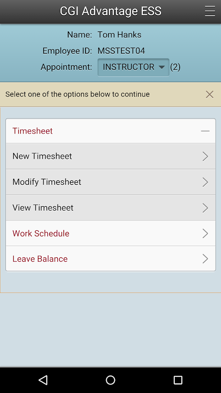 CGI Advantage ESS Mobile Timesheet provides employees with access to key CGI Advantage ESS features while away from their workstation.For example, timesheet submission may need to be completed by noon every friday. The mobile version allows employees to complete the following key tasks at their convenience.