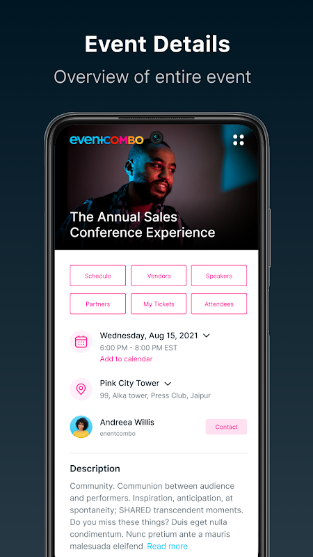 La aplicación de eventos para asistentes brinda una experiencia única para que los asistentes se mantengan conectados entre sí y reciban notificaciones automáticas mientras interactúan de manera inmersiva con todas las partes interesadas de su evento, antes, durante y después de la experiencia. Con esta aplicación, puedes: