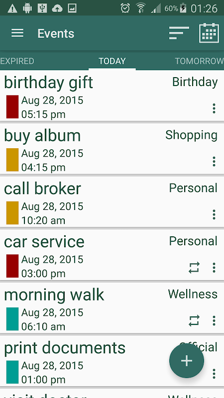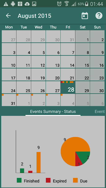 En la página principal una lista de la próxima serie de eventos aparece con la prioridad de color para identificar la claridad importancia. Usted deslizar derecho a ver los sucesos caducados y eventos terminados. Usted Pase a la izquierda para ver la siguiente serie de eventos próximos. Puede abrir el calendario para ver todos los eventos de ese mes, representados como cuadros de estado / prioritarias con códigos de colores. Usted puede ver las estadísticas de los eventos con los gráficos de barras y pastel para supervisar su progreso con eficacia. Usted puede añadir eventos con sólo hacer clic en un punto de vista de día o de la lista de eventos programados para ese día.