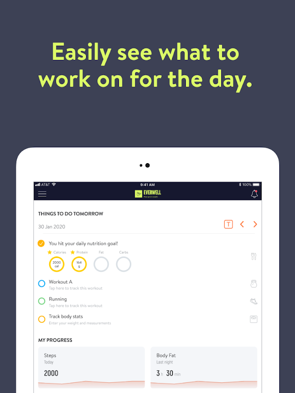 Con la aplicación Everwell, puede comenzar a realizar un seguimiento de sus entrenamientos y comidas, medir los resultados y lograr sus objetivos de acondicionamiento físico, todo con la ayuda de su entrenador personal.