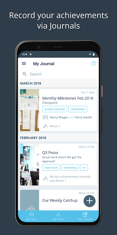 Los empleados pueden capturar éxitos y comentarios sobre la marcha. Compártalo con otros (en particular, con sus gerentes) y vincule sus éxitos continuos con sus objetivos. Incluso tome una foto o selfie para capturar ese gran momento.
