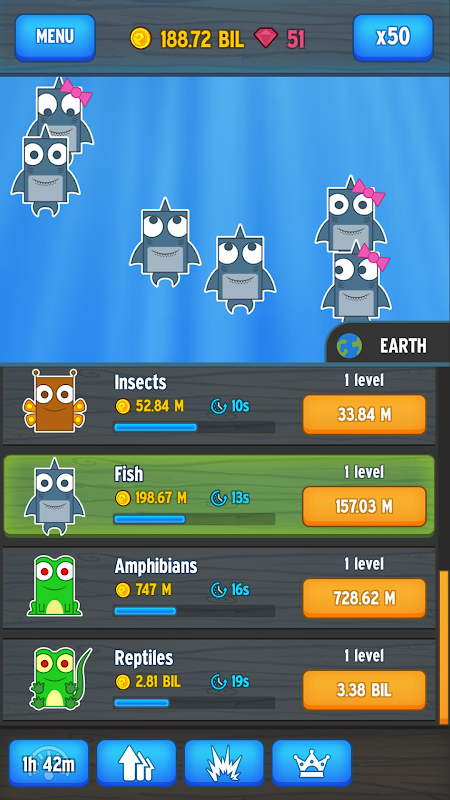 Una vez que tus monos evolucionen a humanos, se abre un nuevo aspecto importante del juego. ¡Desarrolla progreso científico! No todos los científicos están involucrados en el estudio de la evolución o el desarrollo de gafas de realidad virtual (VR). Algunos de ellos se dedican a cosas más importantes, como la conquista del cosmos. Cuando no hay otro lugar para evolucionar, puedes desarrollar tu programa espacial y lanzar misiles. Lo más importante es superar las leyes de la física y poner el primer cohete en órbita. Después de esto, es posible colonizar nuevos planetas.
