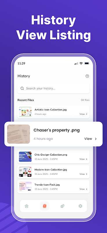 El ocr imagen a texto almacena los datos extraídos a los que puede acceder a través de la opción Historial. Le permite acceder, editar y compartir el texto extraído anteriormente sin la necesidad de volver a escanear las imágenes originales.