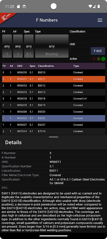 Números F: Búsqueda rápida de grupos de metales de aportación para procedimientos de soldadura y calificación de rendimiento. La búsqueda incluye clasificaciones con las respectivas descripciones del uso previsto. Los datos los proporciona C-spec. Las asignaciones de números F y A se basan en las tablas QW-432 y QW-442 de la Sección IX de ASME, Sección II de ASME, Parte C, Tablas B1 y B2 de AWS B2.1 y AWS A5.1 a AWS A5.36.