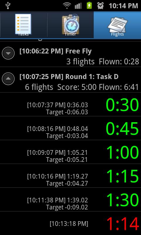 Select from the available official F3K tasks, special practice tasks, or configure your own. The timer displays and calls out your flight, window and target times as they change throughout the task. Target time is adjusted where necessary as you progress through the task.