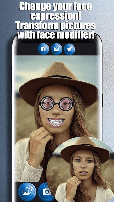 😎 Puedes transformar tu rostro por completo con Cambiador de caras con efectos! Mejora los detalles graciosos de la cara o haz una carcajada divertida, depende totalmente de ti. Esta aplicación de edición de fotos adhesivas te sorprenderá. Es súper fácil: todo lo que tienes que hacer es aplicar una pegatina a tu imagen favorita. Puede agregar sonrisa a la foto, así como diferentes temas y calcomanías con un simple toque de su dedo. El cambio de rostros nunca ha sido tan divertido! Esta aplicación cambiará tus fotos. También es un gran asesino del tiempo! Estiliza tus imágenes y comparte una sonrisa con tus amigos con tu nueva aplicación de pegatinas para cámara.