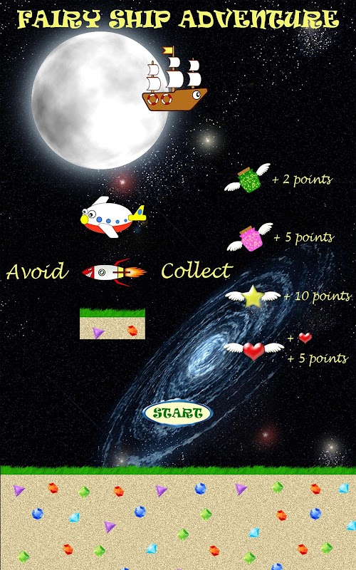 Try to catch the flying stars to get points bonus and catch the flying hearts to recover fairy dust for your fairy ship.