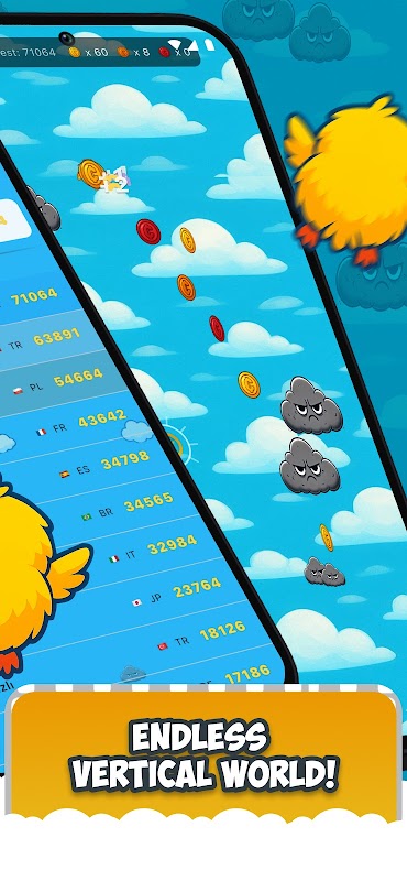 - Caídas de arriba a abajo estilo Flappy con controles precisos de un solo toque