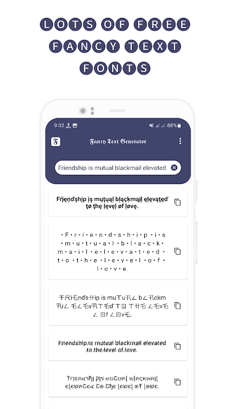 Fancy Text Generator es una herramienta útil que ayuda a convertir texto normal en diferentes textos geniales con estilo, por lo que ayuda a crear texto con símbolos geniales y fuentes elegantes. Básicamente, es un generador de arte de palabras, generador de letras, generador de fuentes... para generar letras geniales, mensajes elegantes, símbolos de texto, símbolos geniales, escritura elegante... Esta aplicación de fuentes geniales es útil para Instagram, Facebook, Twitter, Whatsapp , Snapchat, TikTok, ...