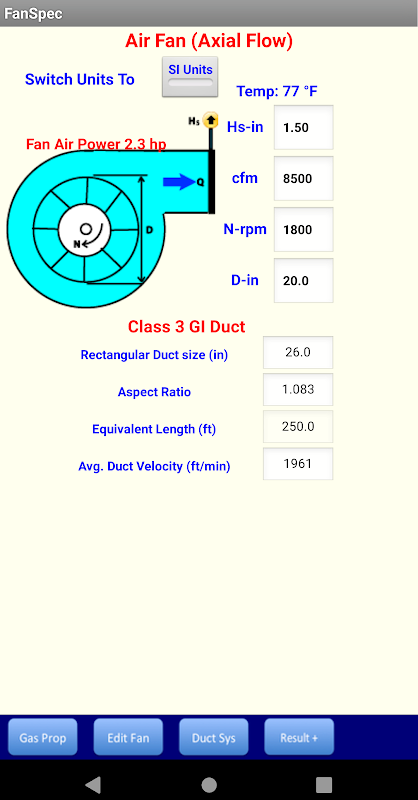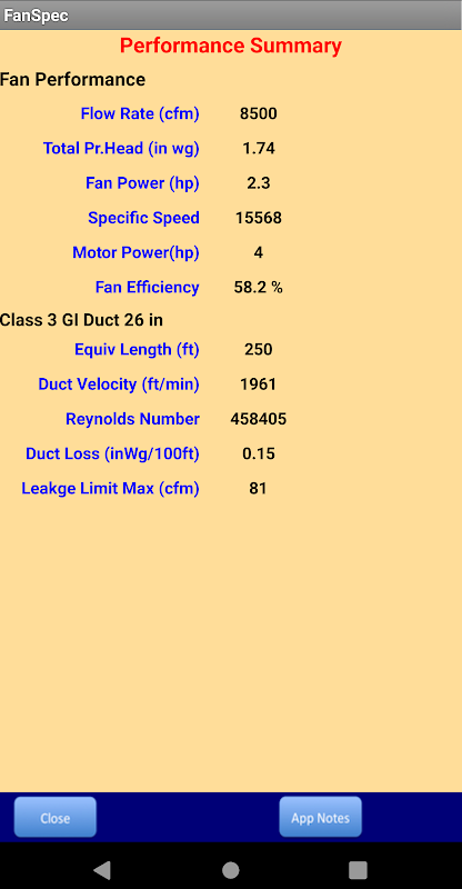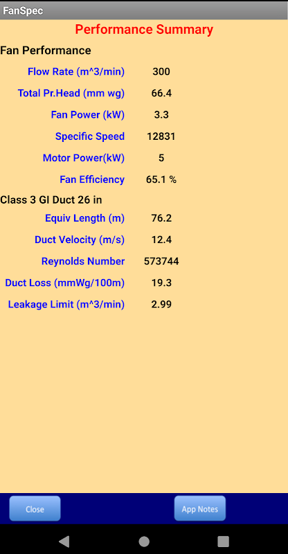 App ayuda en la evaluación de diferentes especificaciones de ventilador para una aplicación dada. La mayoría de los fabricantes proporcionan curva del ventilador (Q vs H) y el punto operativo en esta curva depende del tipo de sistema de conductos, la velocidad media del conducto, la pérdida de presión del conducto y las tasas de fuga del conducto. Por lo tanto la selección de un ventilador adecuado para el sistema de conductos dado es muy crítica para el rendimiento y la eficiencia energética satisfactoria.