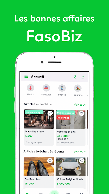 Fasobiz es una plataforma de reventa en línea en Burkina Faso que ofrece las mejores ofertas para todos. Compra y vende de forma segura y sencilla. ¡Fasobiz, el rincón de los buenos negocios en Faso!