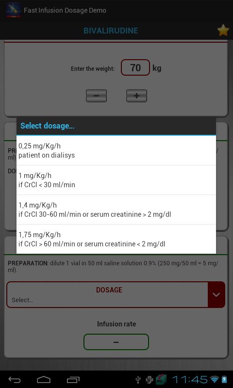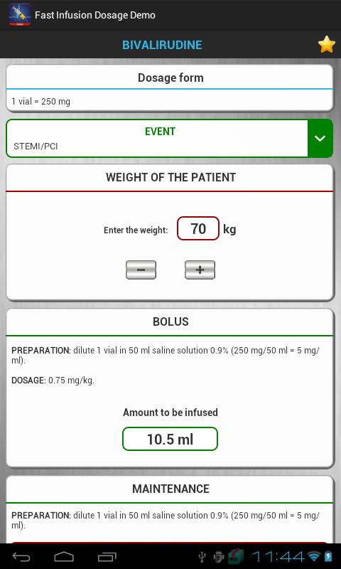 La aplicación,utilizando tablas certificadas por un equipo de médicos, le da a los médicos todas las informaciones necesarias en la terapia de infusión de una manera fácil, clara y rápida de las drogas a seguir: