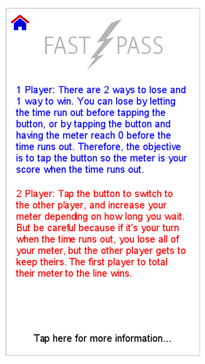 Battle your friends in an epic game of Fast Pass, where you gamble your time against your opponent, BUT BE CAREFUL not to let it be your turn when the time runs out. You will have a random time between 10 and 30 seconds before the round ends, so pace yourself, and tap wisely. The longer you wait to tap, the more points you earn. Also, the later in the round it is, the more points you can get. If it is your turn when the time runs out, YOU LOSE. This means you will lose all the points you got that round, but the other player gets to keep all theirs. The first player whose total meter reaches the End Line WINS!