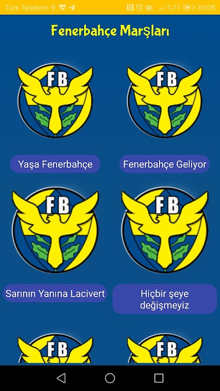 Uygulamada yer alan marşlar aşağıdaki verilmiştir. Uygulamamızda yer almasınız istediğiniz marş ya da FB şarkıları için bize yazmaktan çekinmeyiniz.
