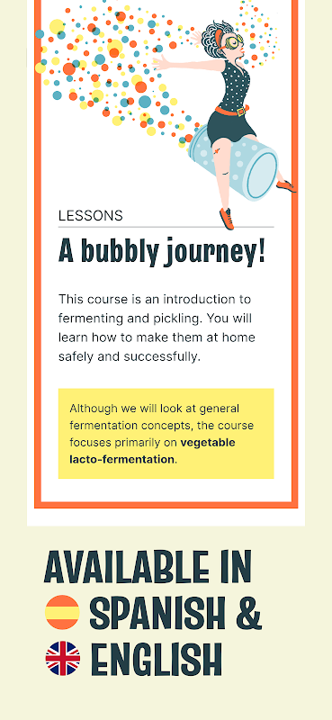 Discover the art of fermentation and pickling with FermentApp! Our comprehensive app is designed to teach you everything you need to know about veggie lactofermentation from scratch and at your own pace. With 10 beautifully illustrated lessons and more than two hours of rigorous content, you'll learn all the theory behind the fermentation process. You can also listen to the lessons while doing other things, thanks to the audio format.