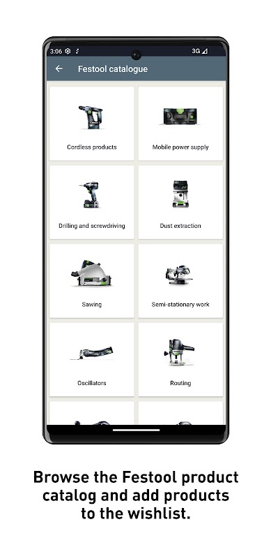 - La app Festool Order se adapta a la perfección a las necesidades de los/las profesionales y les permite encontrar y gestionar máquinas, accesorios y material de consumo, así como crear listas de favoritos y enviarlas a distribuidores de forma fácil, clara e intuitiva. Descárgala ahora de forma gratuita.