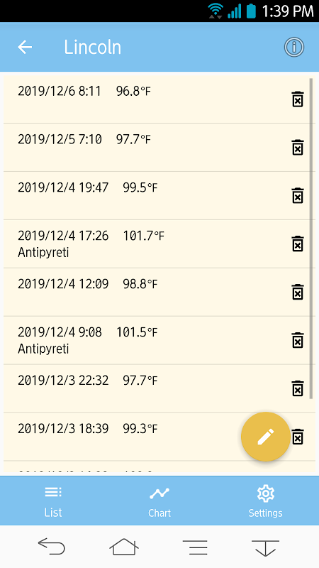 Esta aplicación puede registrar la temperatura corporal y dibujar la tabla, para que pueda saber el momento para ir a la clínica o la escuela.