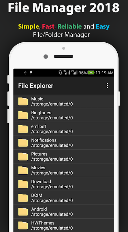 Administrador de archivos y carpetas: - Explorador de archivos - Free File Manager and Browser administra y le ayuda a manejar todos sus archivos y carpetas si están almacenados en la memoria de su dispositivo o en la tarjeta microSD (solo explorar) y compartirlos fácilmente. Encuentre el almacenamiento de su dispositivo directamente desde el Explorador de archivos: Administrador de archivos y navegador gratuitos y explore imágenes, música, videos, archivos, aplicaciones y documentos de Android junto con las miniaturas disponibles.