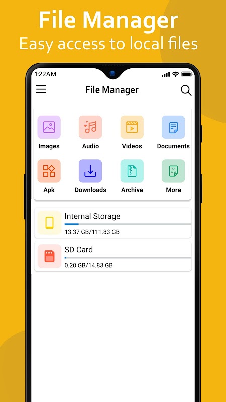 File Manager find all photos, videos, and documents saved on your phone. File Search The optimized search engine of file explorer will find file in internal storage and SD card in 1 second. And users can browse files by category, e.g. image, music, video, apps, etc.