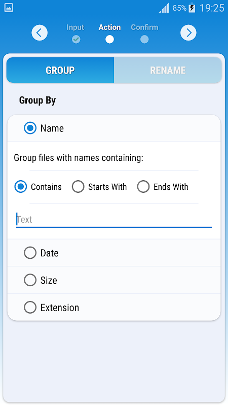 The purpose of the app is to group and rename multiple files at once, in a single operation, based on user's selection of features to apply.