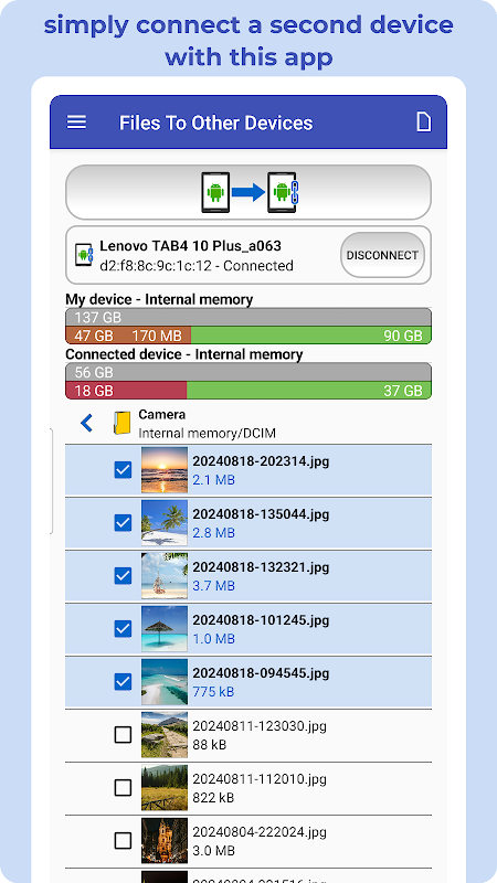 "Files To Other Devices" hace que compartir archivos entre dispositivos Android sea más rápido y sencillo. Ya sean fotos, vídeos, documentos o descargas, envíalos de forma fluida—sin cables ni conexión a Internet.