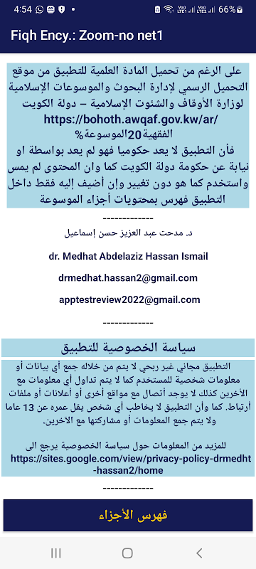 La aplicación no fue desarrollada por ni en nombre del gobierno del Estado de Kuwait. El material utilizado es tal como está y no ha cambiado. Solo se ha agregado a la solicitud un índice del contenido de las partes de la enciclopedia. La solicitud incluye las partes 1 a 15 de la enciclopedia Awqaf publicada por el Ministerio de Awqaf y Asuntos Islámicos - Estado de Kuwait, en 45 partes. Se ha dividido aquí en 3 partes (aplicaciones) con la función de ampliar la fuente sin Internet. La política de privacidad establecida en: