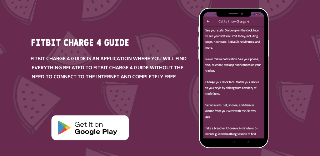 Esta aplicación móvil es una guía que brinda información sobre Fitbit charge 4. Desde esta aplicación, puede obtener información sobre la configuración y el uso del dispositivo, sincronización de fitbit versa, cambio y uso de la banda, configuración de fitbit charge 4, cómo cargar el dispositivo, configuración de notificaciones, navegación, configuración de alarma y cambio de carátula del reloj fitbit charge 4.
