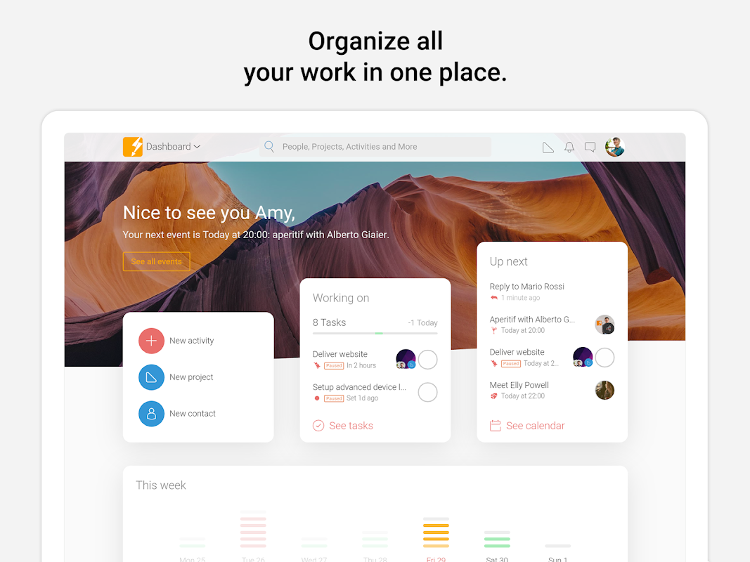 Todo lo que haces y tienes que hacer se resume en tu panel de control. Es el lugar donde comienza a trabajar todos los días: sus tareas, citas y análisis de tiempo de trabajo están todos en un solo lugar, lo que ayuda a su mente a concentrarse solo en lo que sigue.