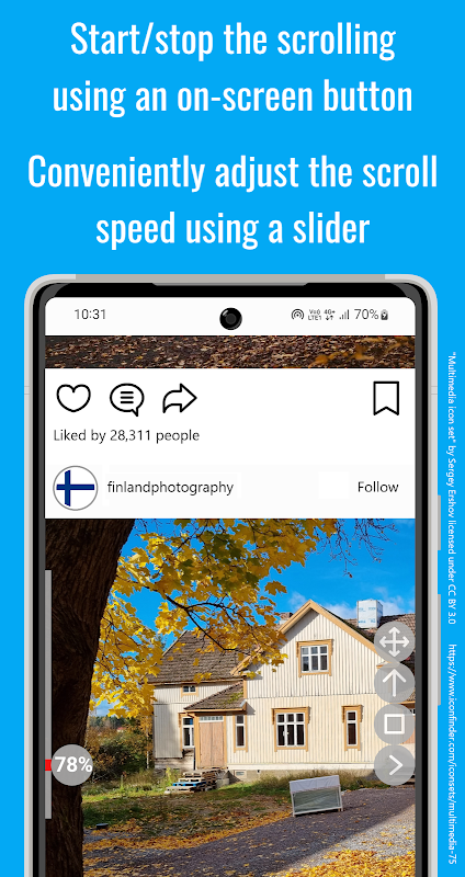 Flex Scroll agregará un widget flotante a la pantalla, con botones para el desplazamiento automático: desplazamiento continuo hacia abajo / hacia arriba, página hacia abajo / hacia arriba y página hacia la derecha / página hacia la izquierda. También agrega un control deslizante en el margen, lo que le permite ajustar cómodamente la velocidad de desplazamiento automático mientras se desplaza.