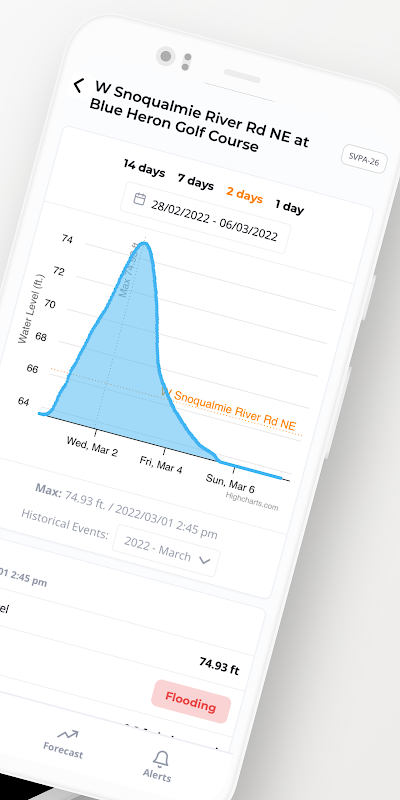 Floodzilla proporciona información sobre inundaciones en tiempo real para el valle de Snoqualmie, que incluye: