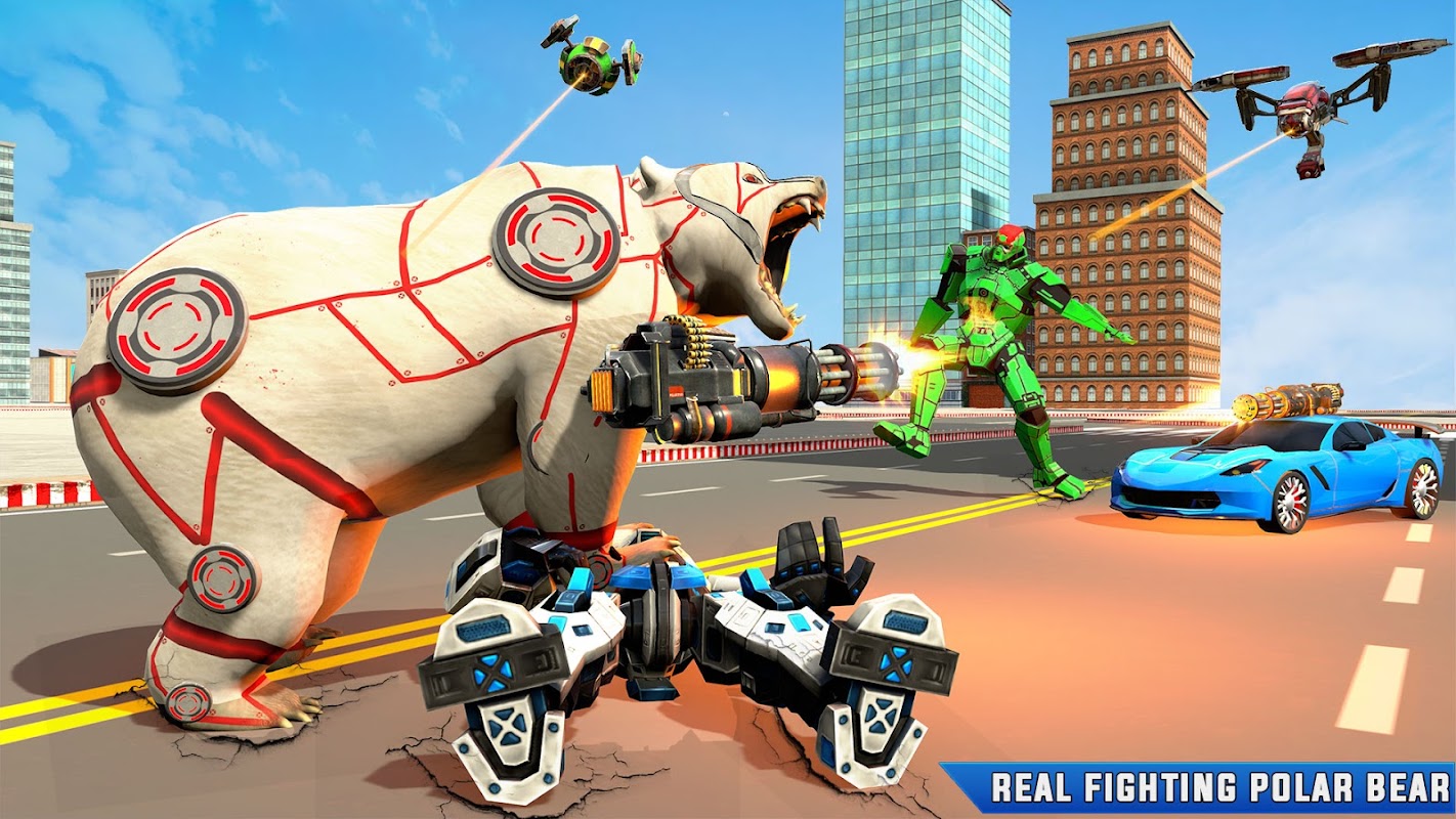 El juego de transformación de robots tiene la entrada más nueva: el juego de transformación de coches voladores de robots de osos polares. la robótica enemiga está sembrando el terror en una ciudad de osos geniales en el último juego de osos robot en la batalla del juego de transformación de robots. El poderoso robot oso polar ayudará a salvar la ciudad eliminando a los enemigos que deambulan en los juegos de robots de transformación de ciudades robóticas. ¿Te preparas para transformar al superhéroe robot en un juego de robot oso polar? El centro de la ciudad es donde han comenzado las guerras de robots entre el gran héroe robot y el héroe robot oso polar que puede transformarse en un robot de coche volador. La transformación realista de robots de automóviles enunciará tu emoción de jugar juegos de robots transformadores además de los juegos de robots de osos polares. El juego de coches de transformación está esperando a todos los entusiastas de los coches voladores.