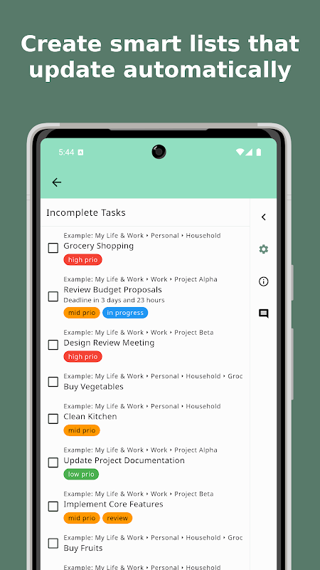 🔍 Encuentra cualquier cosa rápidamente: Busca en todas tus notas y tareas al instante. Crea listas inteligentes que reúnen elementos automáticamente por etiqueta, estado o fecha.